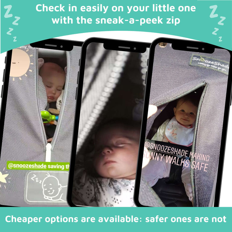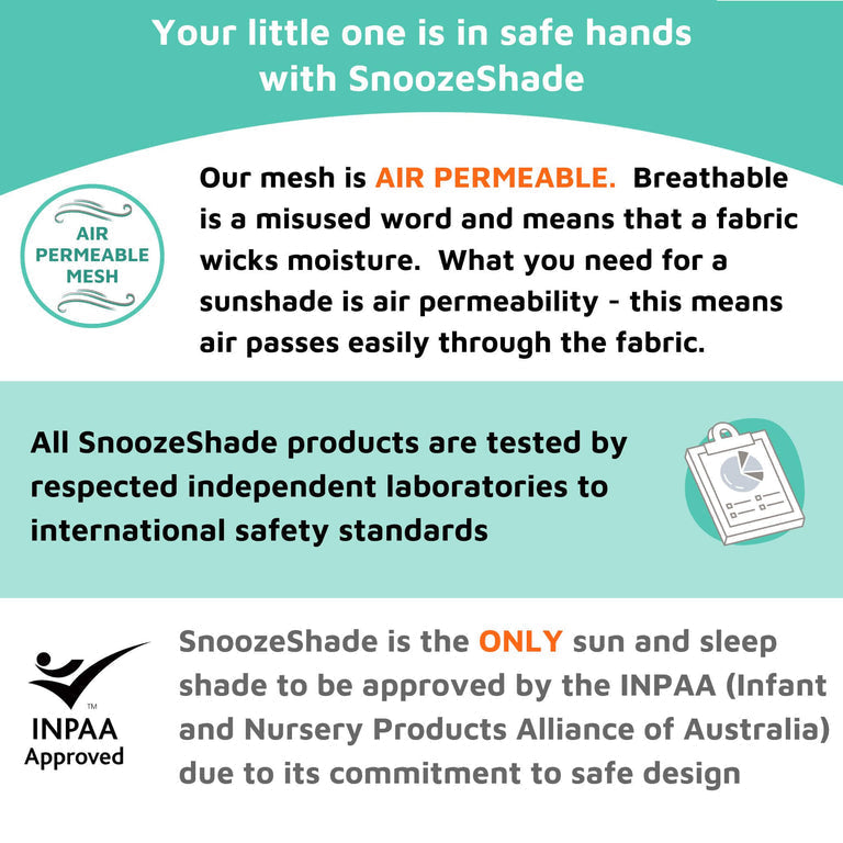 SnoozeShade was invented by Cara Sayer – a safety-obsessed mum who wanted to help her daughter sleep soundly and stay protected from the sun while in her pushchair. Unlike a blanket or muslin, our scientifically tested fabric is air permeable, which means air passes through it freely. If you were to hold a SnoozeShade up to your face you’d be able to breathe comfortably.